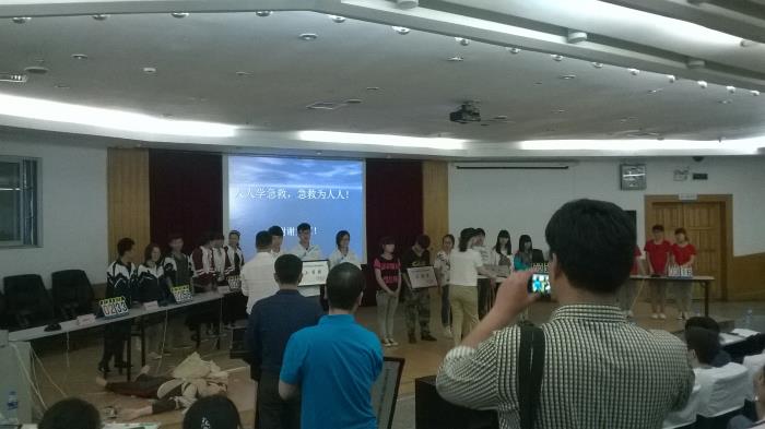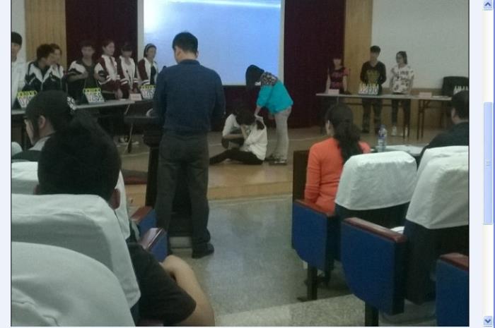 5月7日下午三时,我校石碧云,郗纪晴,李梦艳三名同学组队参加了由市红十字会、团市委市教育局在市中心医院内科大楼二楼报告厅联合举办的“苏宁杯”应急救护、防灾减灾知识竞赛团体赛。比赛共分为判断题、选择题、抢答题、实操题四个部分。