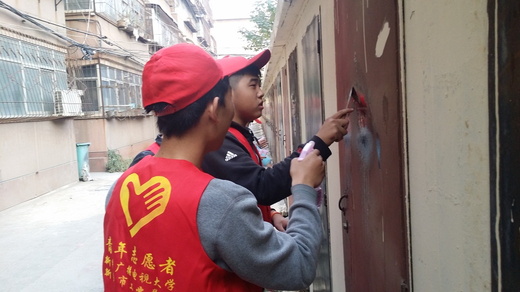 同学们佩戴统一的志愿者帽,身穿志愿者马甲,拿着喷壶、小铲、扫把等工具,有的清除门上的非法小广告,有的清扫院内卫生,在同学们的齐心协力下,家属院很快就被打扫的干干净净。