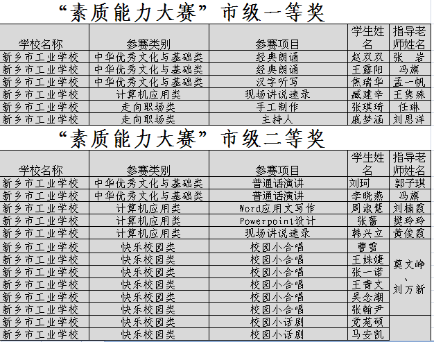 通过专家评选,我校在素质能力大赛市赛中,共产生一等奖6人,二等奖22人,三等奖20人,并荣获素质能力大赛优秀团体奖和优秀组织奖。