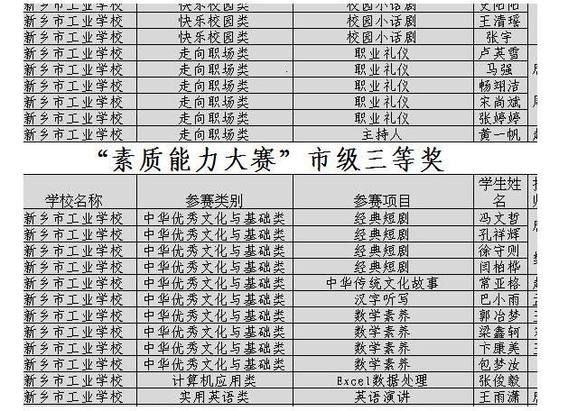 今年6月10日在新乡市职业教育中心举办了全市中等职业学校学生素质能力大赛的初赛,其中素质大赛共设基础类、计算机应用类、实用英语类、快乐校园和走向职场等5大类24个项目,全市17所职业学校576名优秀选手参赛。