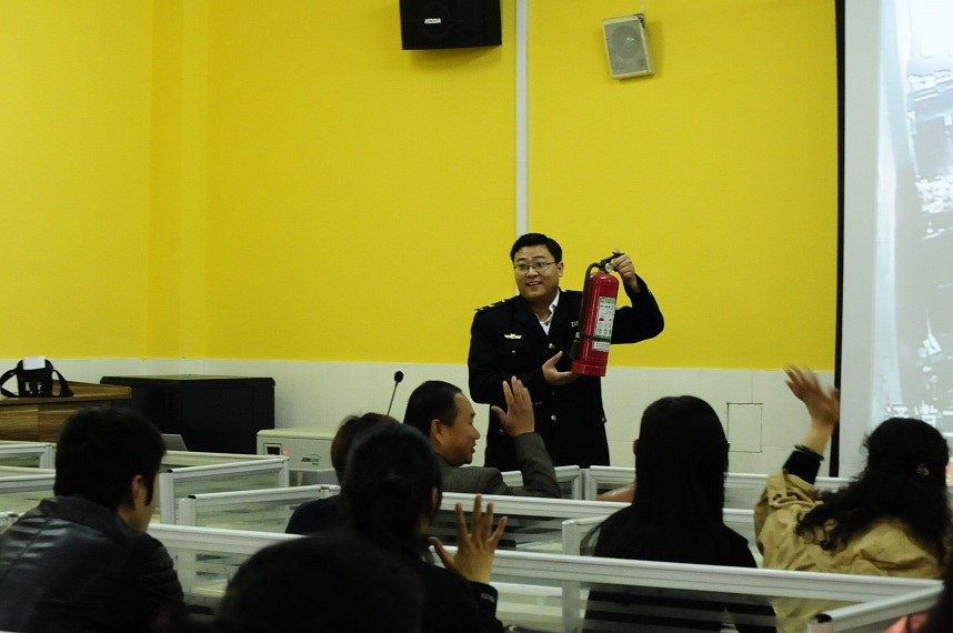 马教员首先为大家列举了近期发生在我们身边,因缺乏相关消防知识而发生的惨痛“悲剧”,发人深省。然后,教官向大家讲解了基本的消防知识,涉及火灾发生的原因、怎样预防火灾、火场逃生基本知识、灭火器的正确使用以及如何正确报警等内容。在讲解的过程中,他不仅从理论上教育大家应提高消防安全意识,而且通过亲自示范如何正确使用灭火器和其他求生工具,来让大家切实体会具备基本消防安全知识的重要性。