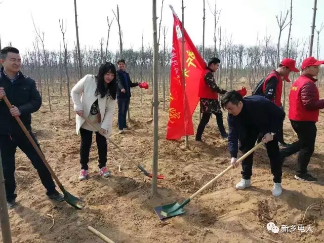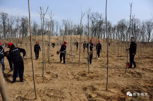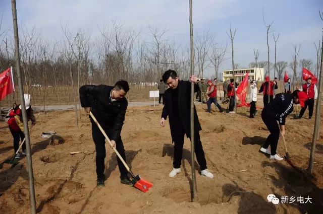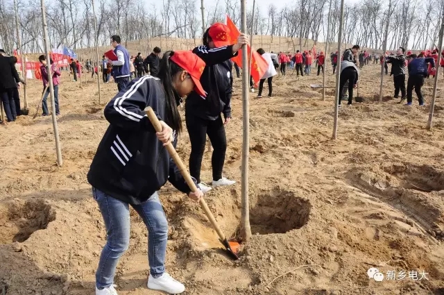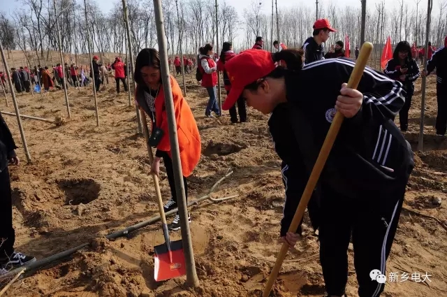 植树现场,同学们身着统一的服装,在现场工作人员的技术指导下,以饱满的热情、十足的干劲,拿起铁锹等工具行动起来,打坑、种树苗、填土、扶正、踩实,整个现场处处是植树者忙碌的身影。鲜艳的团旗、志愿者旗与大家绽放的笑容形成一道亮丽的风景,经过两个多小时的奋战,1700余株整齐的树苗正式在这片土地上扎根、成长,为生态环境整治、拥护自然环境、美化城市面貌、建设绿色新乡出了一份力。