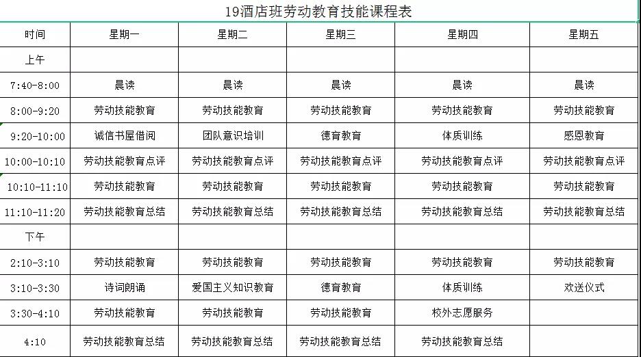 在劳动技技能课中,所有同学都将进行劳动技能“七个一”活动:每天一次晨读、每周一次志愿公益服务活动、每周一次诚信书屋借阅活动、每周一次军事拓展活动、每周给家长一封信、每班一个定制劳动技能教育课表、每天学习一篇美文。各位同学通过劳动技能课,在学校形成了劳动最美丽、劳动最光荣、劳动最时尚的风气,也使同学们养成良好的劳动观念,掌握劳动技能,同学们的人际交往能力、协作能力、组织能力和操作能力以及适应环境能力进一步提高。更重要的是,通过劳动技能课的学习,培养了学生的参与意识、创新意识和勤于实践、勇于探索、精诚合作的精神,不断提升学生精神境界、道德意识,完善学生道德品质。