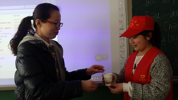 除了一直开展的每周青年志愿者参加“你扔我捡”的活动外,本周又增添了向老师敬上一杯热茶的活动。一句:“老师您辛苦了”,“老师您请喝茶”。体现出了学生们感恩的心,同时也温暖了老师的心。