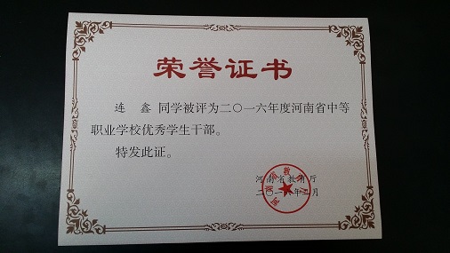 根据《河南省教育厅关于评选2016年度中等职业学校省级优秀学生、三好学生、优秀学生干部及先进班集体的通知》(教职成【2015】1088号)精神,我校严格按照公开、公平、公正的原则差额遴选推荐。经过省教育厅的审核、公示无异议后,我校13级建筑三班的连鑫、14级电商一班的赵双双、14级电商二班的王诗葳分别被评为省级中等职业学校优秀学生干部和三好学生的称号。